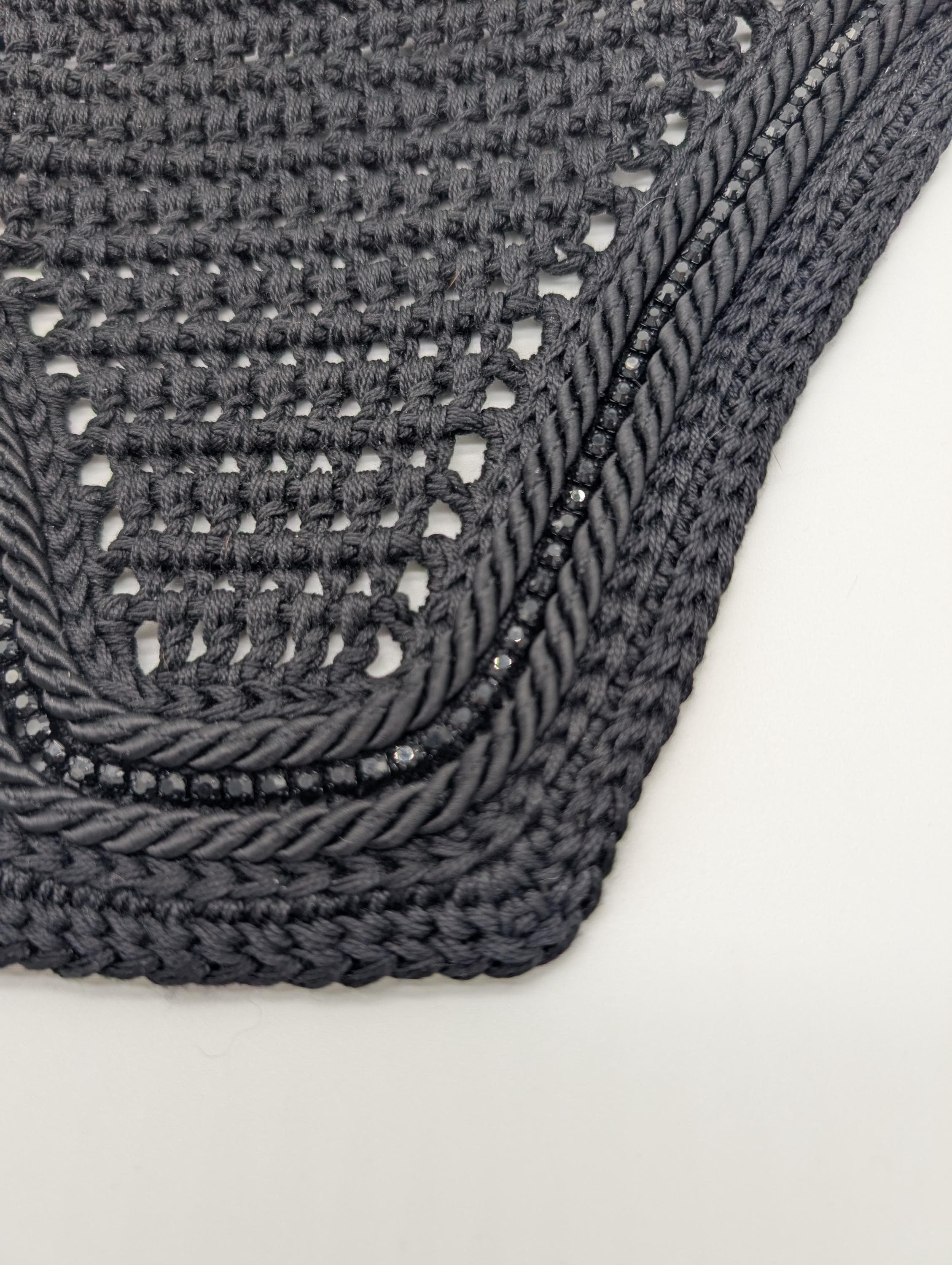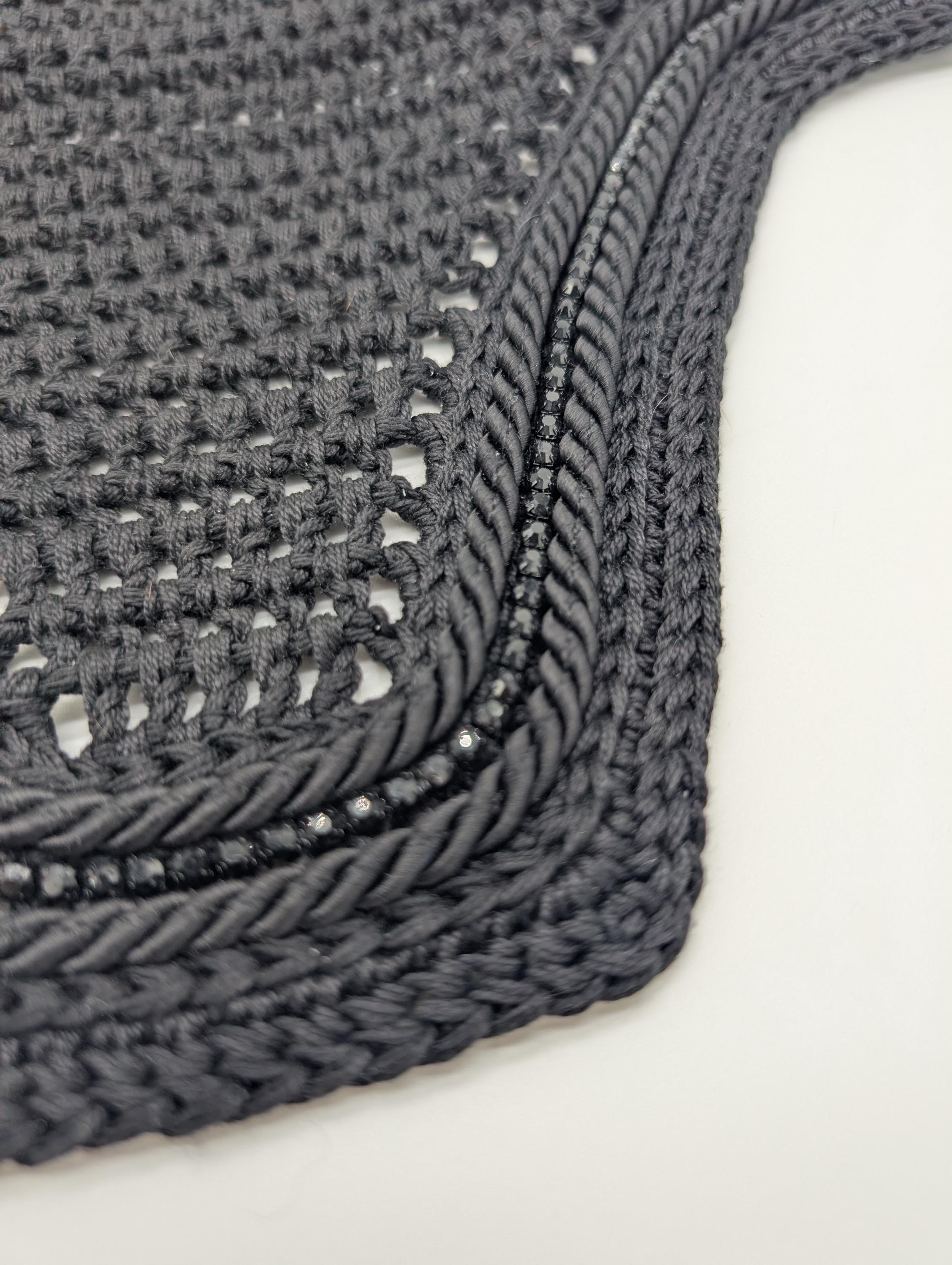 Black horse fly bonnet with all the sparkle! Available here in a horse sized square front style. This bonnet features one row of rhinestone chain between two rows of black cord. Available in the Customizable section of my shop in additional sizes and styles.