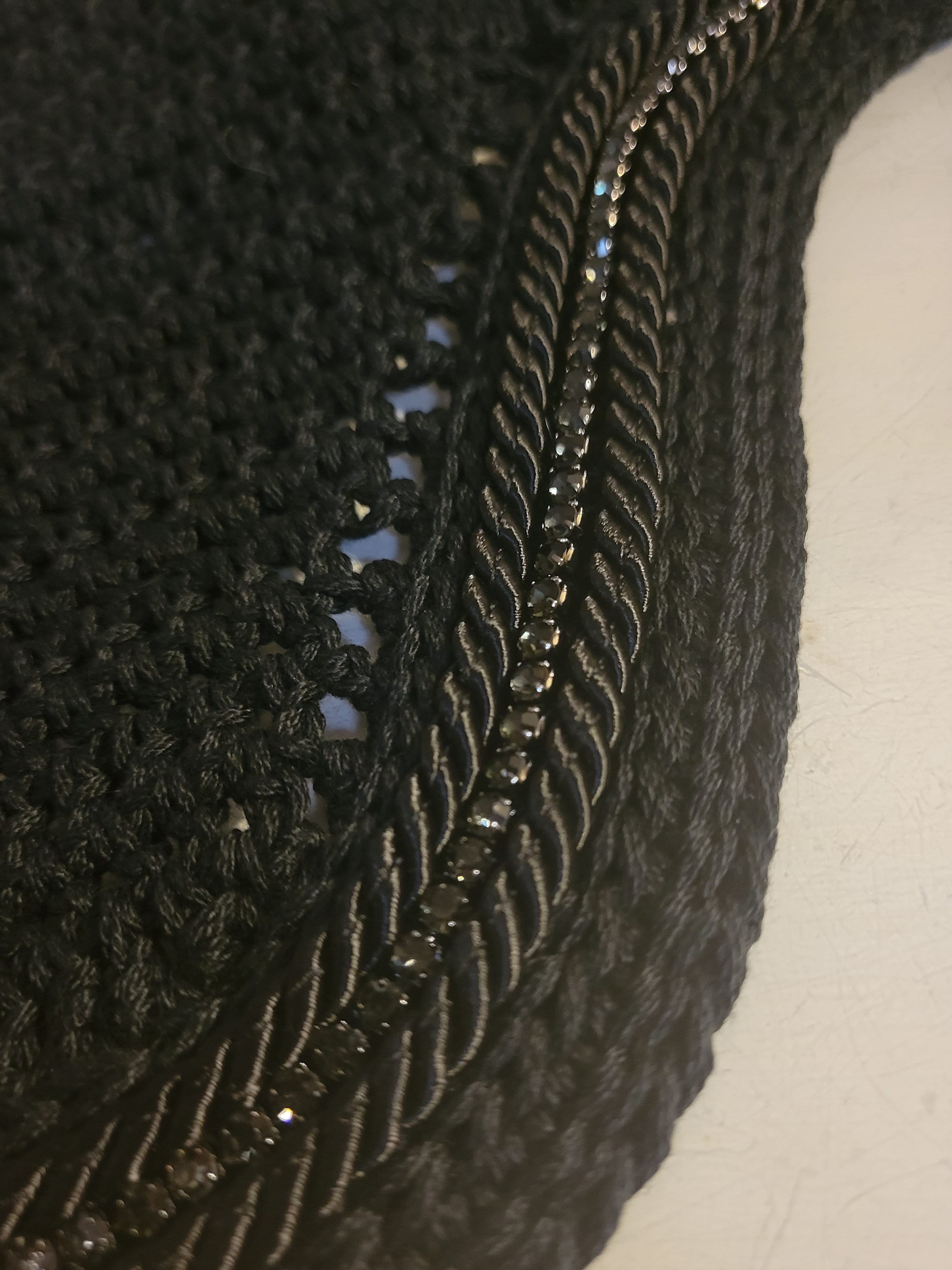 Black horse fly bonnet with all the sparkle! Buyer's choice of v-shaped front, square, or rounded front style (pictured). See photo diagram for reference on styles. You'll love this one, if you are all about sparkle! This bonnet features one row of rhinestone ribbon, black cord, and a row of black rhinestone chain - it's the ultimate in sparkle! Buyer's choice of cob, horse, or warmblood size. The sizes and styles available on this listing are ready to ship, all sizes and styles are available for order in the customized bonnets section of my shop and able to be shipped in 1-2 weeks.