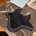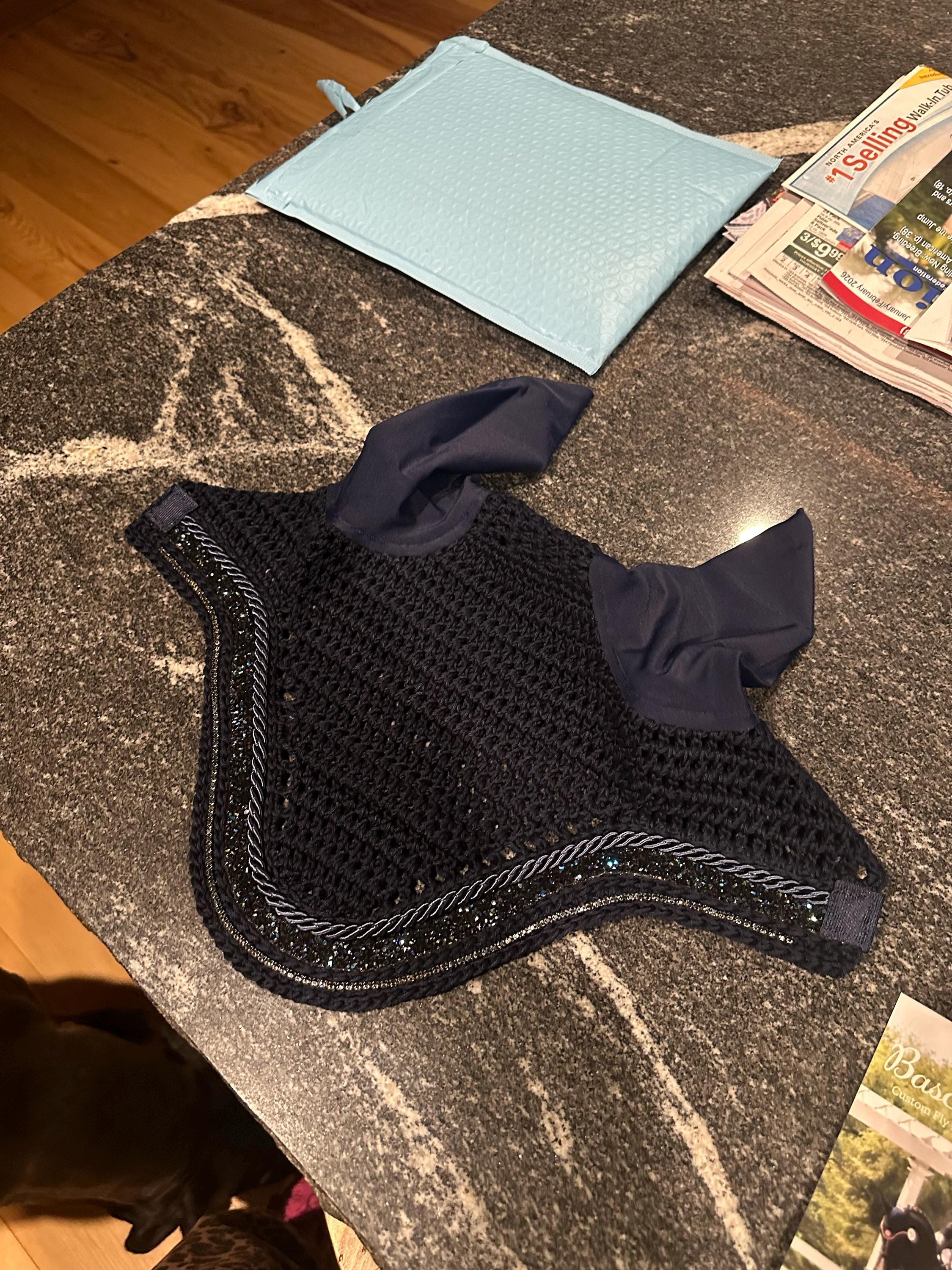 Dark navy horse fly bonnet with double rhinestone trim! Bonnet features a dark navy base, navy cord, black AB rhinestone ribbon, and dark blue rhinestone chain. Buyer's choice of v-shaped front, square, or rounded front style (pictured). See photo diagram for reference on styles. You'll love this one, if you are all about sparkle - it's the ultimate in sparkle! Buyer's choice of cob, horse, or warmblood size. Pony size available by special request. Love the monochromatic color scheme? Visit the Customized Bonnets section of our shop for a black, grey, and brown version of this bonnet.