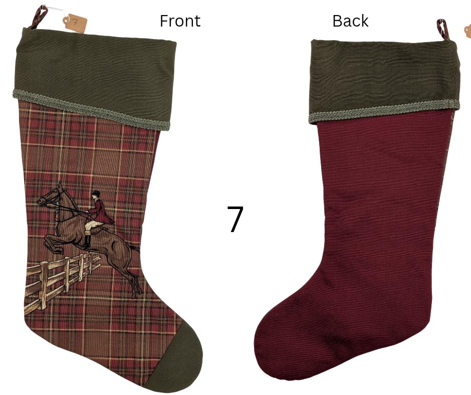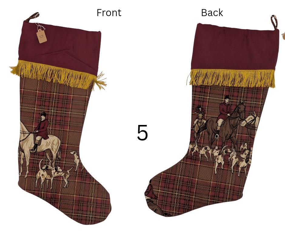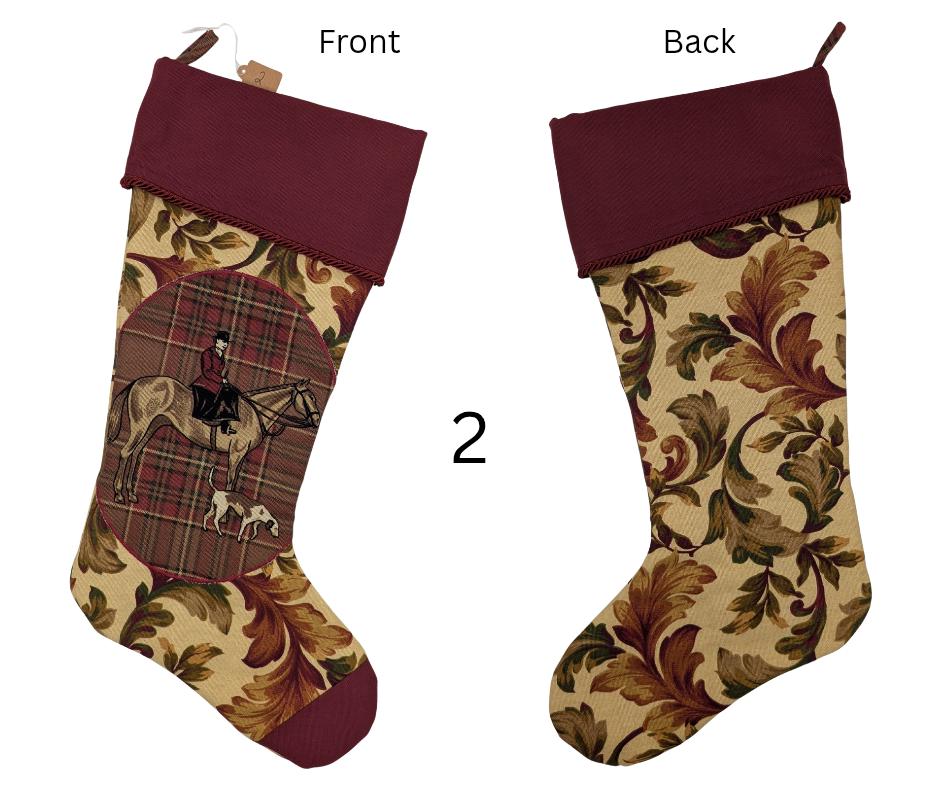 Each stocking is individually handcrafted, making every piece truly one-of-a-kind. The placement of the fabric design varies slightly, ensuring no two stockings are ever identical. Many feature similar rich tones and classic fox-hunting motifs, enhanced with unique stitching details that add extra character and craftsmanship.