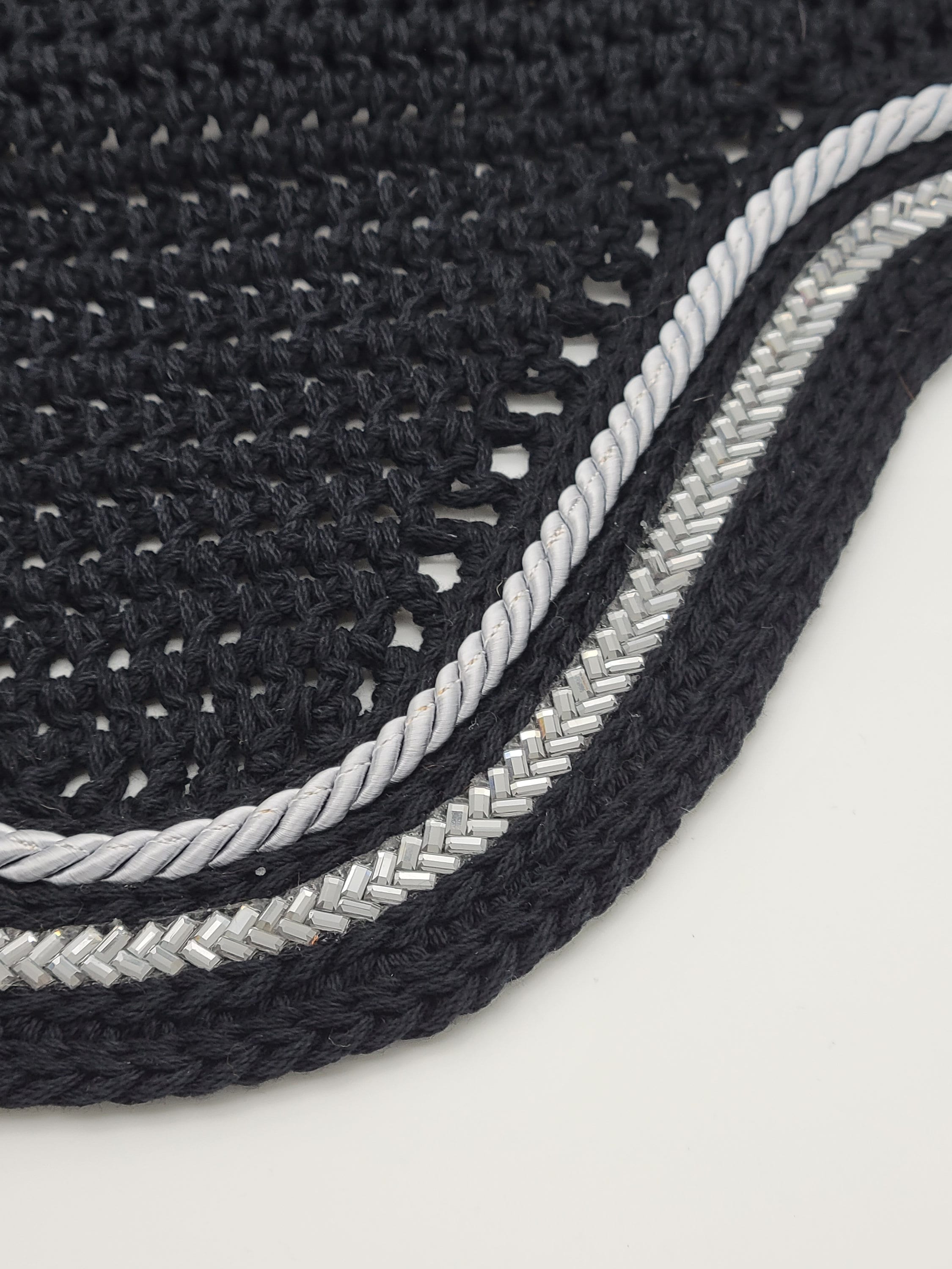 Black horse fly bonnet with grey cord and grey herringbone tile trims. The herringbone trim offers a slight sparkle in the sun. This bonnet is pictured in a rounded front style but is also available in square front, v-shaped, and tie-down front styles.