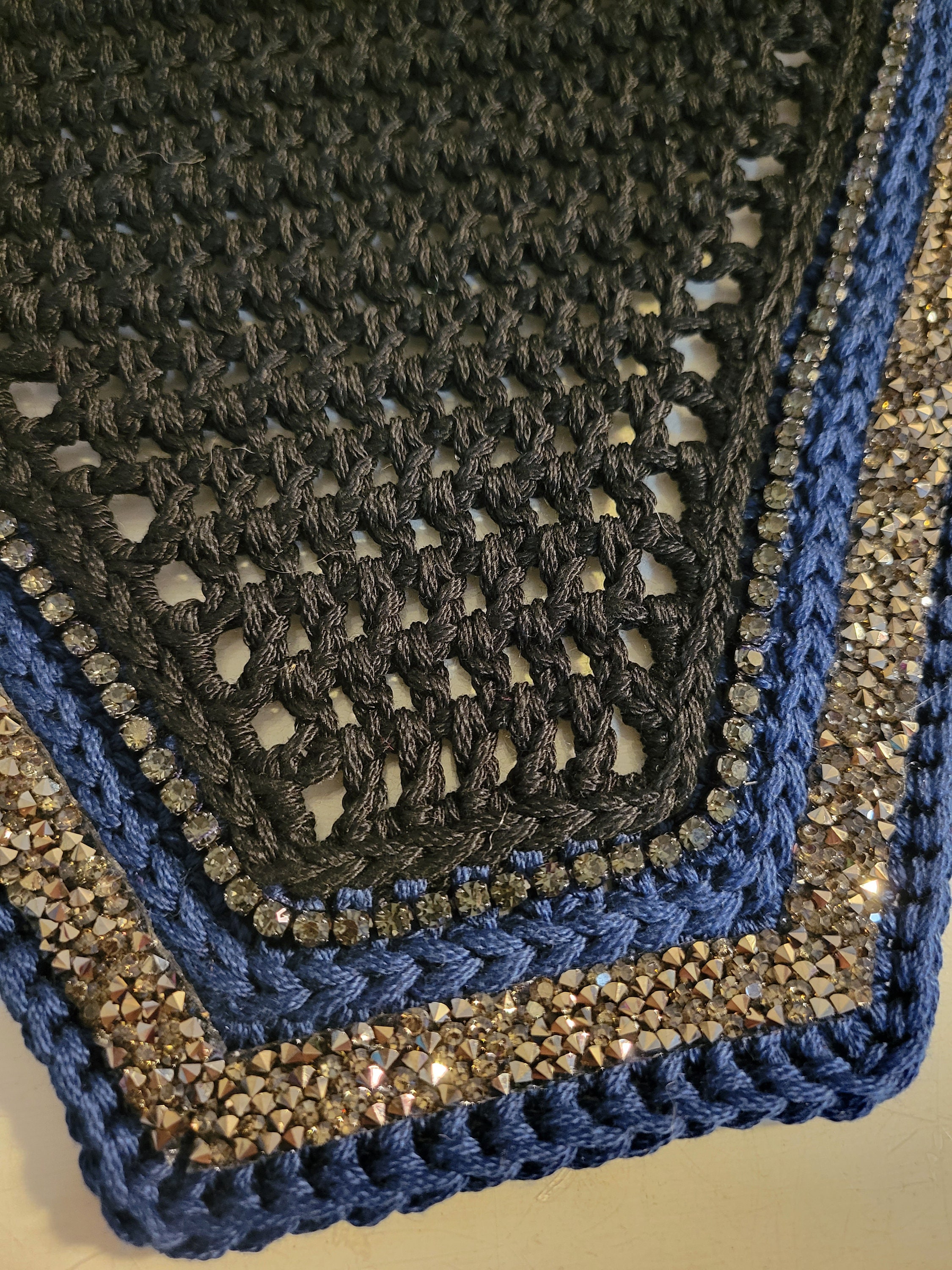 Black horse fly bonnet with blue accent trim and all the sparkle! Buyer's choice of v-shaped front, square (pictured), or rounded front style. See photo diagram for reference on styles. You'll love this one, if you are all about sparkle! This bonnet features one row of gunmetal rhinestone ribbon and a row of black rhinestone chain on navy crocheted trim. This one is the ultimate in sparkle! Buyer's choice of cob, horse, or warmblood size. Pony size available by special request.