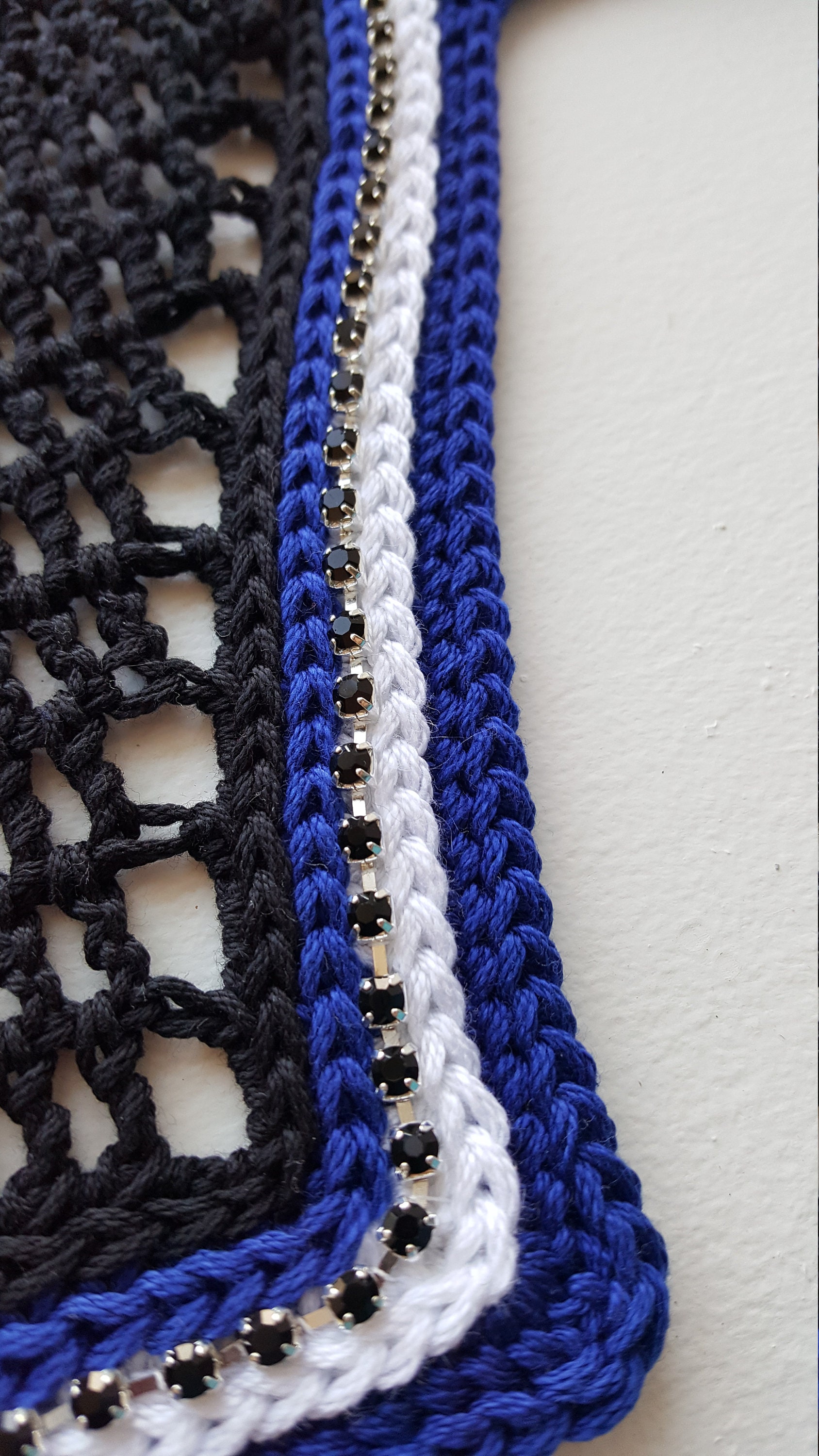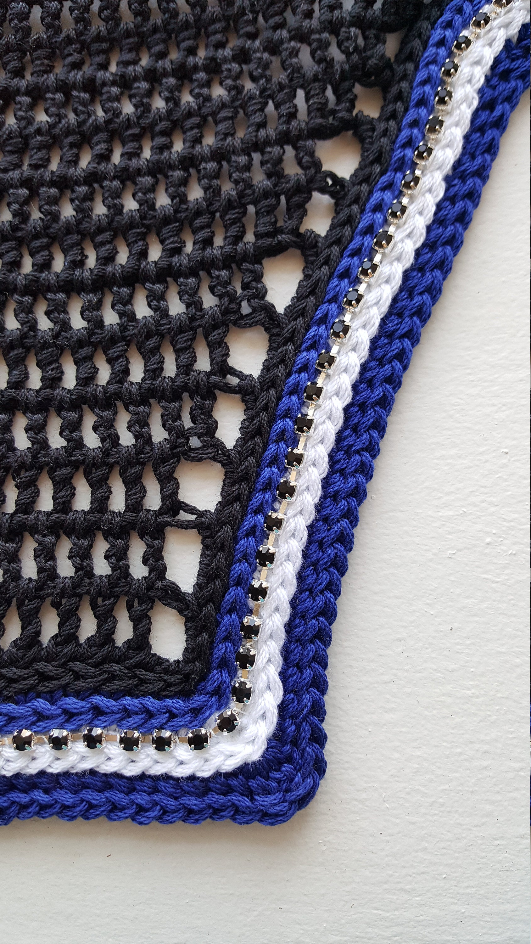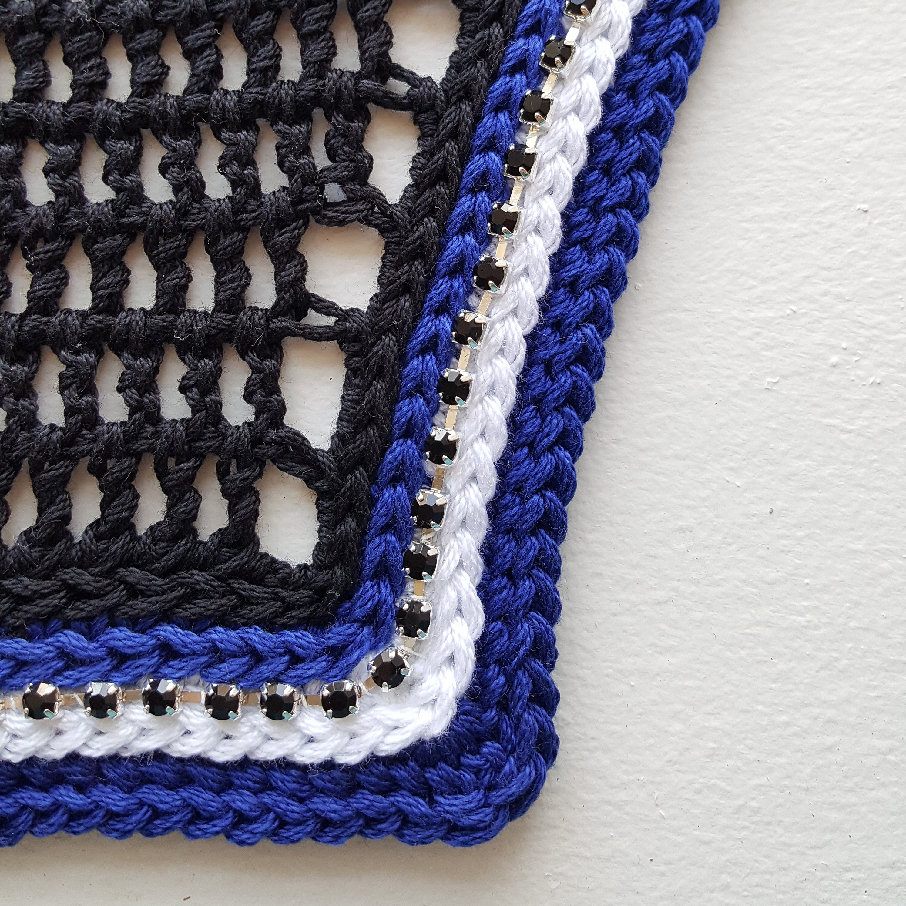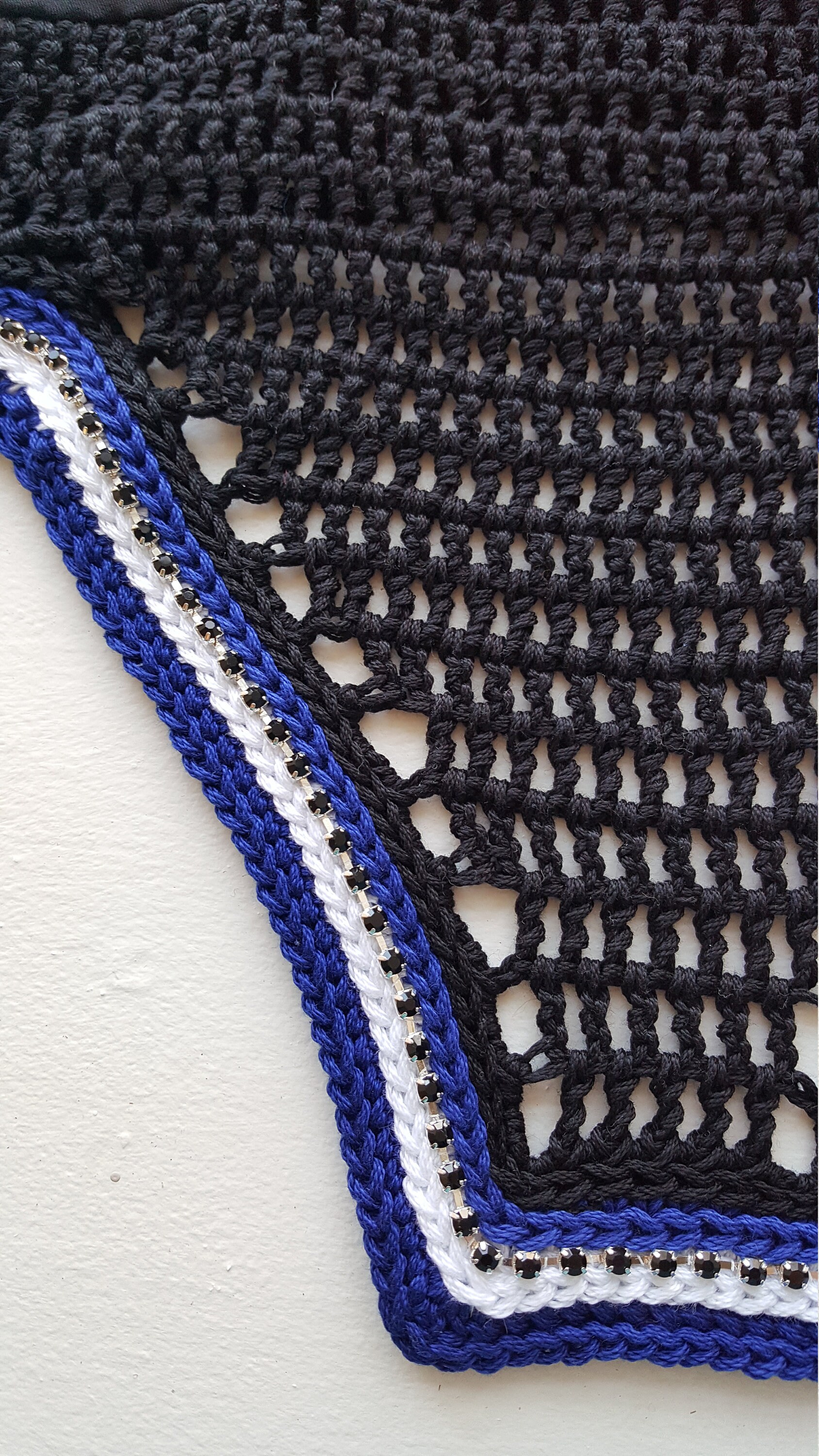 Black horse fly bonnet bonnet with royal blue and white trim. Accented with black rhinestone chain trim for a bit of sparkle without being too bold. This one has a been a favorite with many of my clients - get yours today! Pictured in a square front style but also available in rounded front and v-shaped front styles (see photo diagram for reference on styles).