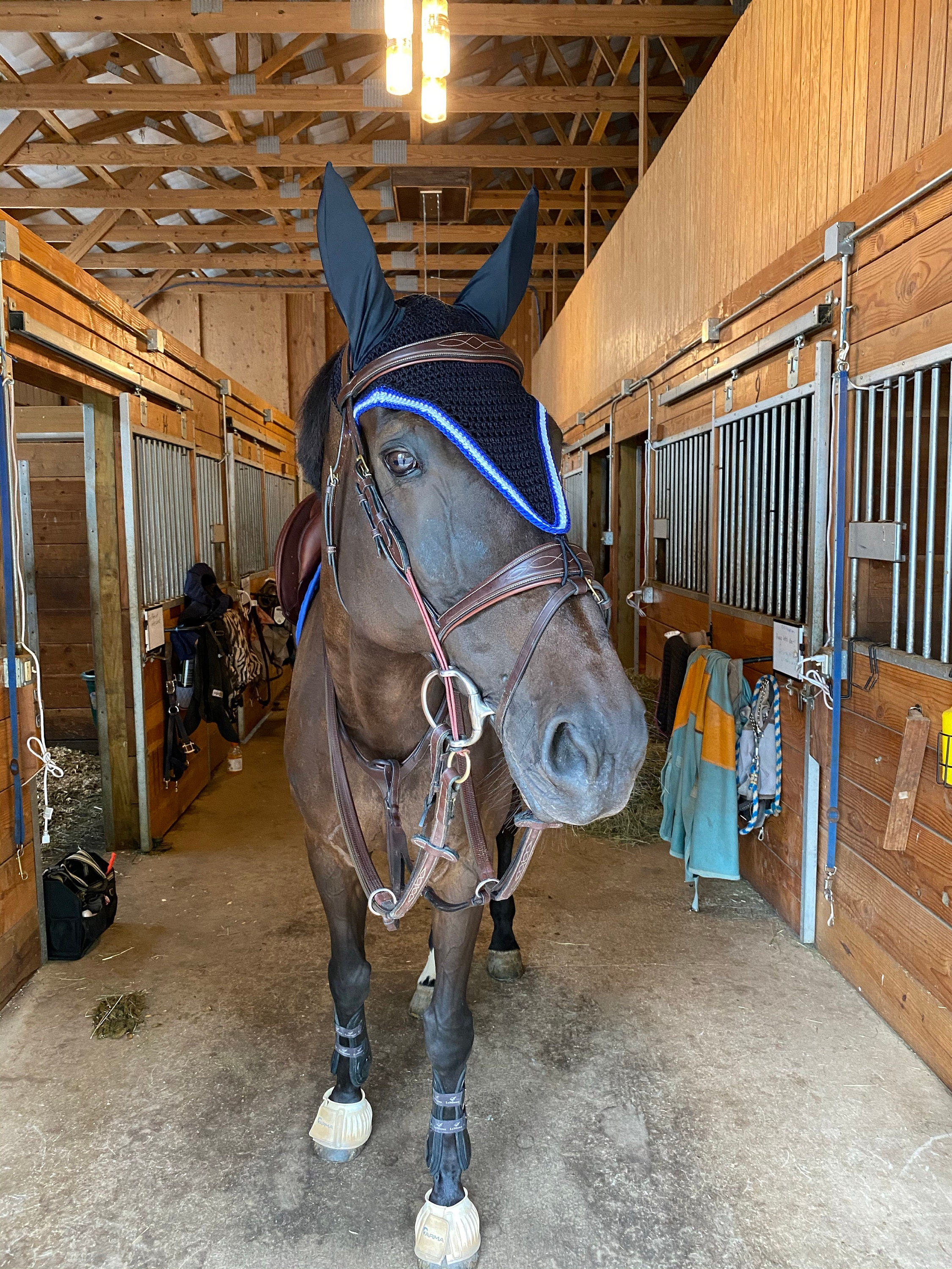 Not quite the color or sizing you were looking for? Contact me today to inquire about placing a custom order. Custom bonnets can be done in a variety of colors and sizes to accommodate your horse's specific needs.