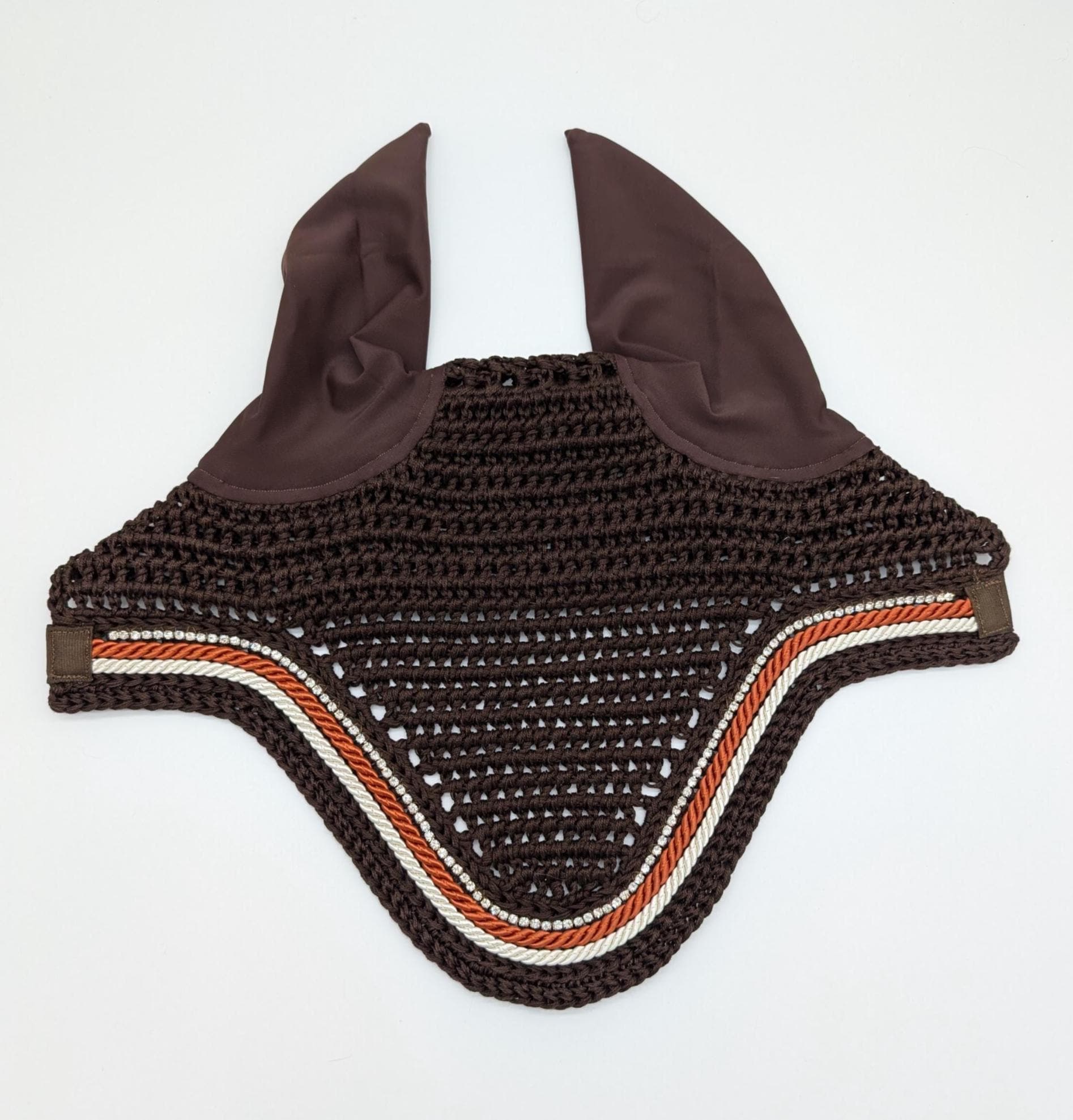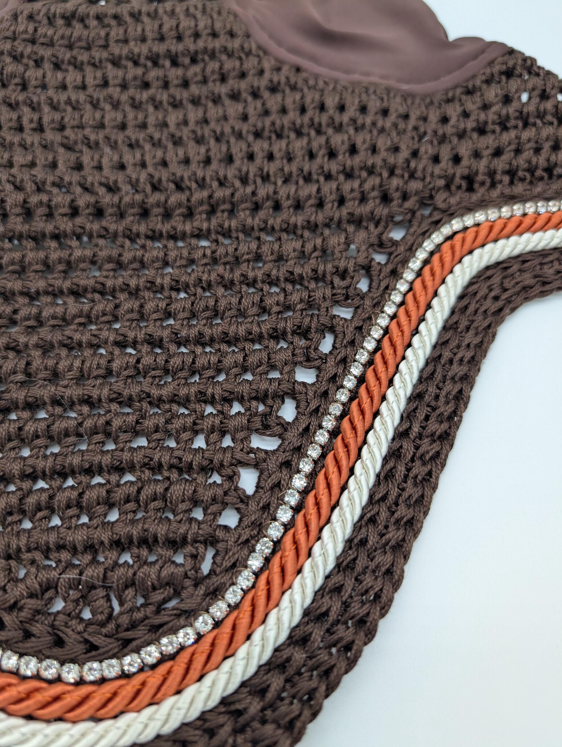 Bring a warm, polished sparkle to your horse’s look with this handmade brown crochet fly bonnet, thoughtfully designed for comfort, durability, and eye-catching style.