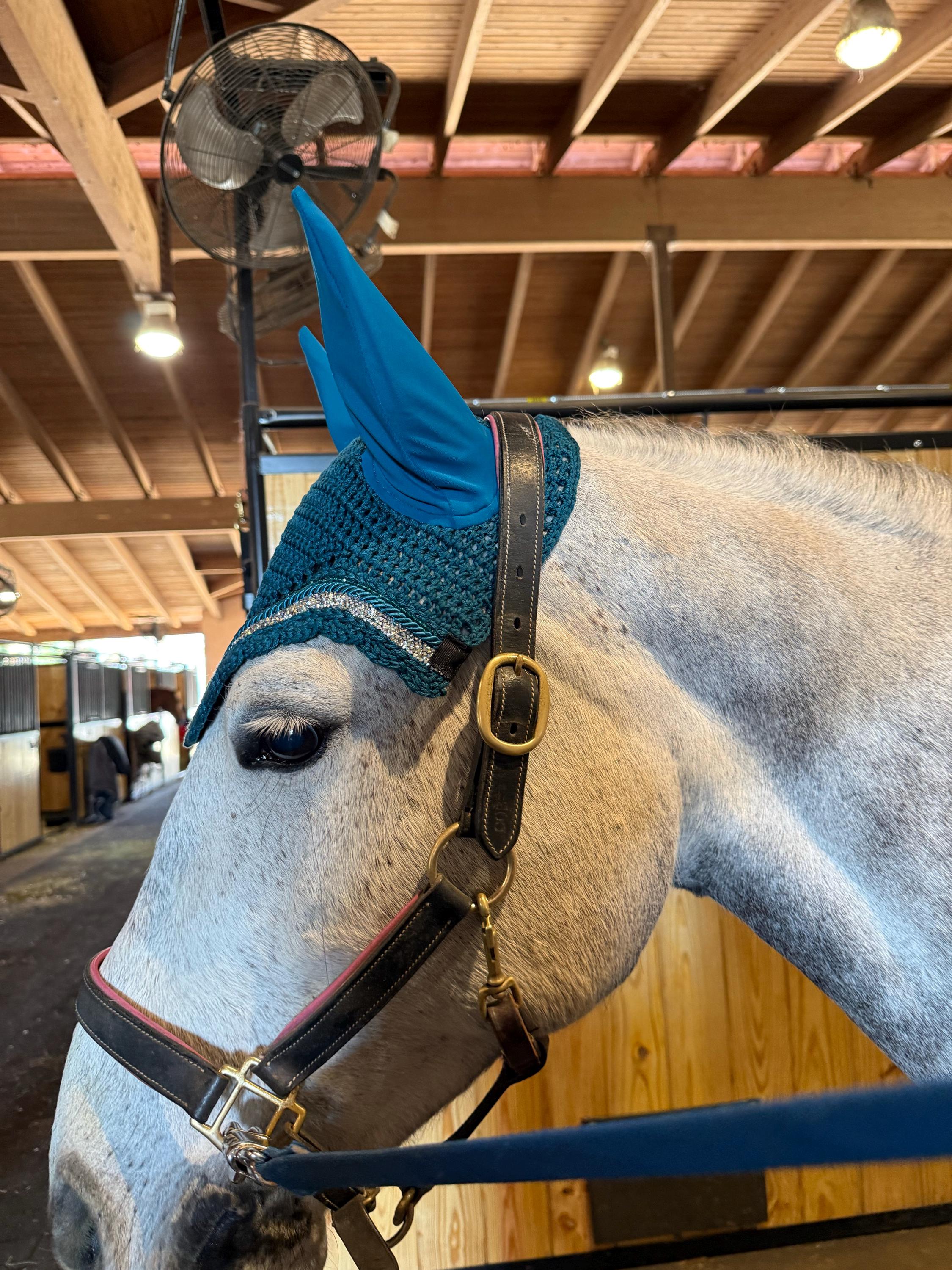 Add a pop of color to your horse’s look with this handmade teal fly bonnet. Designed for both beauty and function, this bonnet features a rich teal crochet body paired with a touch of sparkle. The bonnets is trimmed with coordinating teal cord, a row of teal crystal beading for subtle sparkle, and a stunning silver AB rhinestone ribbon that shifts beautifully in the light. Perfect for the show ring or everyday rides when you want your horse to stand out.