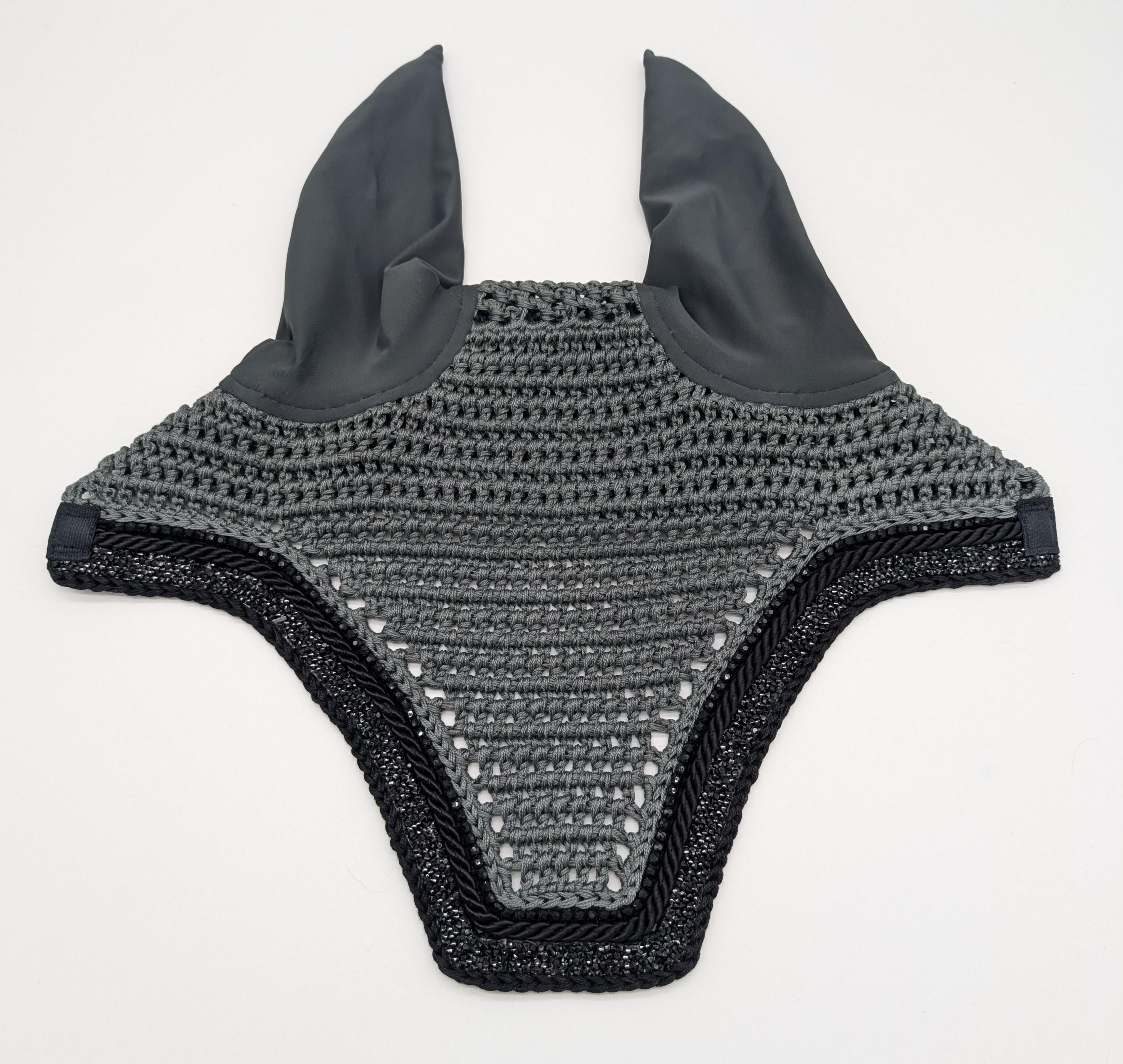 Sleek, modern, and thoughtfully detailed. This handmade horse fly bonnet features a rich charcoal gray crochet body paired with smooth black stretch ears for a clean, versatile look that complements any tack setup.