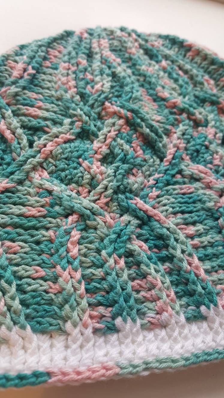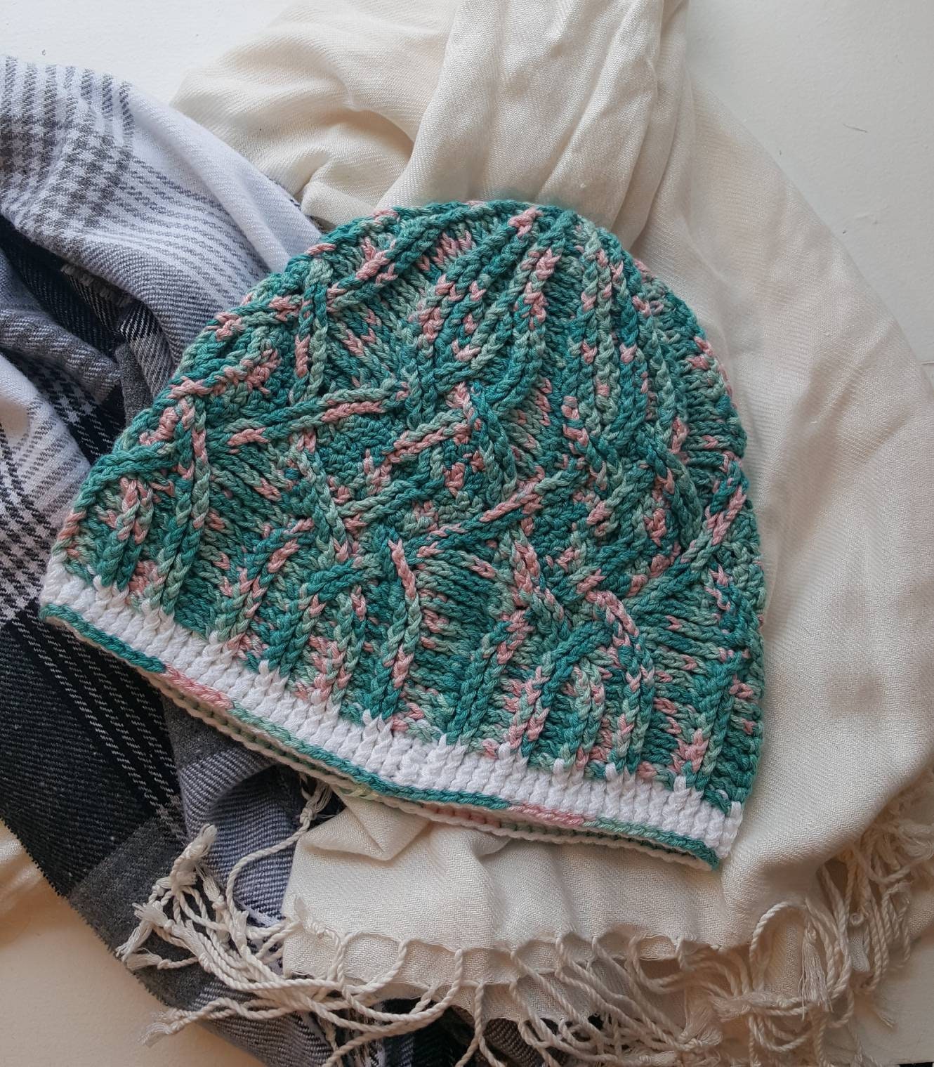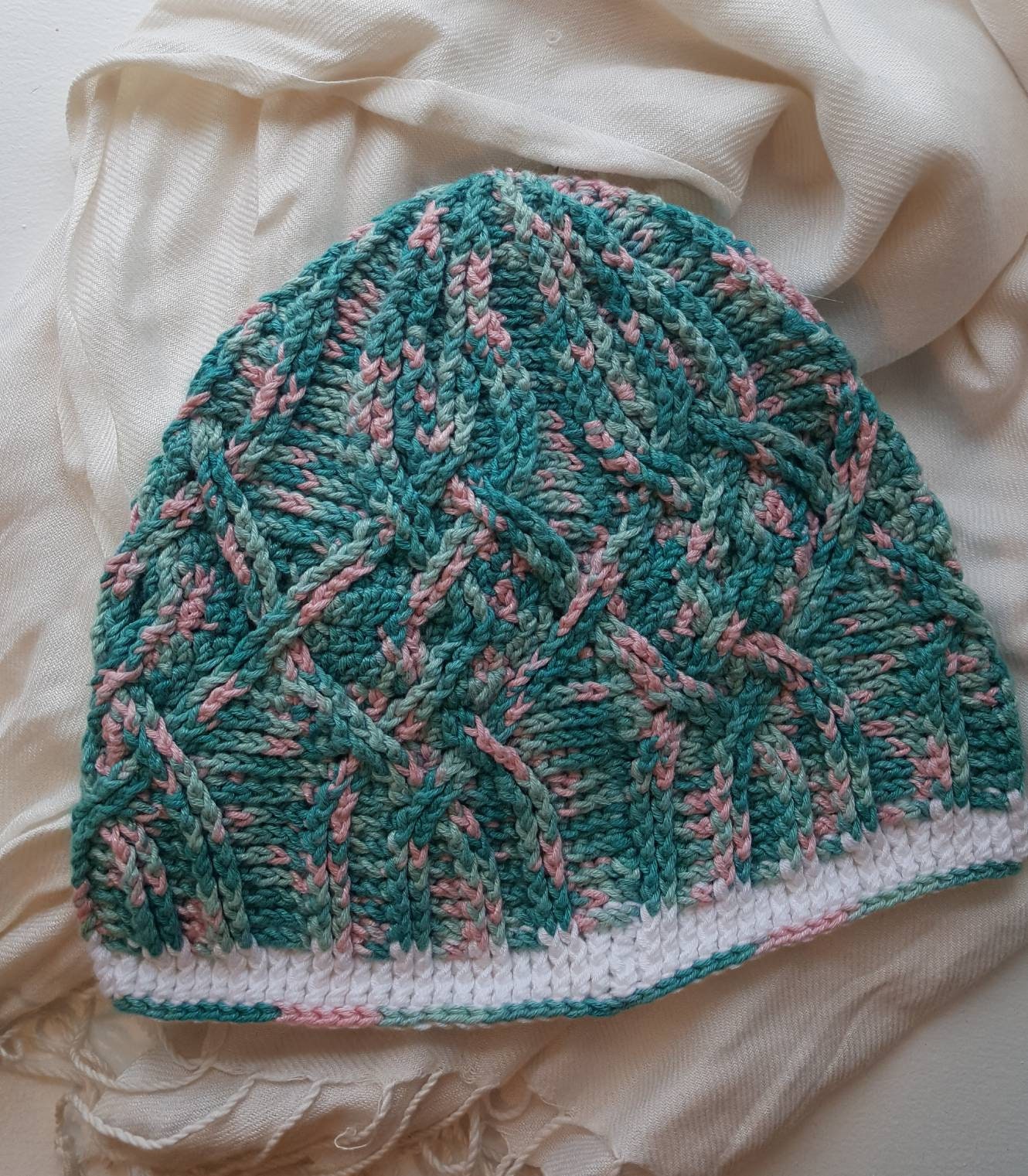 This women's crochet hat is the perfect winter accessory. It's super cozy and comfortably enough to wear all day - and stylish enough to wear all day! Pair it with a pretty scarf for those super cold winter days. Small band of white trim, intricate cabling, and variegated green and pink coloration give this hat a bit of personality as well. Cap is made with a very soft bamboo and silk blend yarn that will make it your favorite and most comfortable go-to hat on cold winter days. This is a fiber I recommend for all skin types as it's excellent for people with skin sensitive to natural fibers. Hat is sized to fit an adult woman.